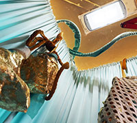 Mary Moser's Friends on Tour - The Visionary Brit MuseumCurtain installation around all four walls of the Visionary Brit Museum. Front and back and exterior of curtains are shown with swags spray painted with ribbon upholstered ties facing the front entrance of the museum with upholstered and spray-painted hoses. A further two plastered swags with enamel paint and gold leaf and ribbons and pins are attached. Ceiling hand painted in gold enamel and a lino flooring on a hand-built platform. |